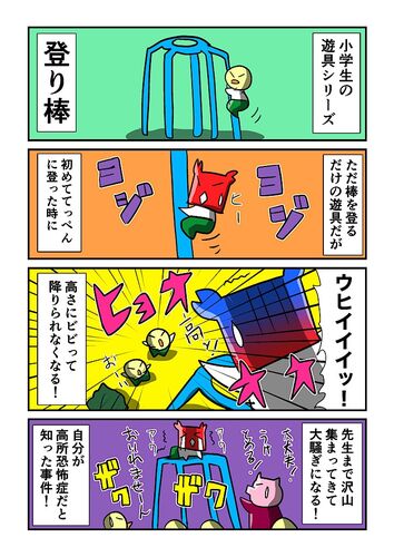 【たわばガニのジモトーーク!その114】棒にしがみついて登るだけの遊具「登り棒」の話。低いところで登り降りしてるうちは良かったけど、初めて一番上まで登りきった時に、その高さにクラクラして降り方が分からなくなってしまったときがある!結局職員室か…