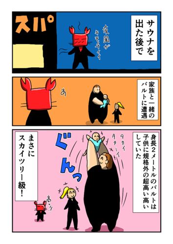 【カニマエロマエその4】いい感じにあったまってサウナを後にすると、外でまたもやバルトに遭遇!小さい子供と美人な女性と一緒だったんで多分バルトファミリーなんだろな〜。そんな子供をおもむろに高い高いするバルト!身長2メートルの高い高いは、見たこ…