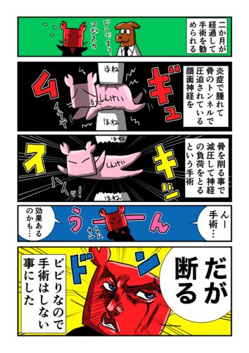 【ラムゼイハント症候群その20】治療開始から2ヶ月が経過して顔面麻痺があまり改善されてない事から"顔面神経減荷術"という手術を勧められました。炎症で腫れてしまった事で骨のトンネル内で圧迫が起こっている顔面神経、それを外科的にトンネルを削って広げ…