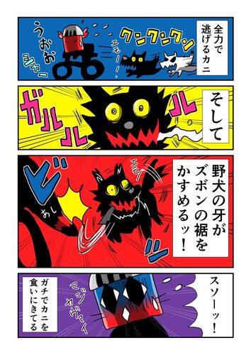 【恐怖体験カニビリバボーその11】バイトの帰り道、野犬に追われて大ピンチ!全力で自転車を走らせるのだが、なかなか振り切れないッ!カーブとかでちょっとスピードを緩めた途端に噛み付いてきて、完全にエサとして認識されてるくさいッ!ズボンの裾とかを…