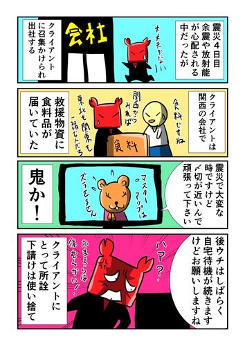 【恐怖体験カニビリバボーその42】 余震も頻発し放射能が降り注ぐとか言われる中で、クライアントに呼び出されて4日目に出社するカニ。震災でひっくり返ったおもちゃ箱のようになった職場を片付ける。東京は流通的には混乱がなかったけど、関西のクライアン…