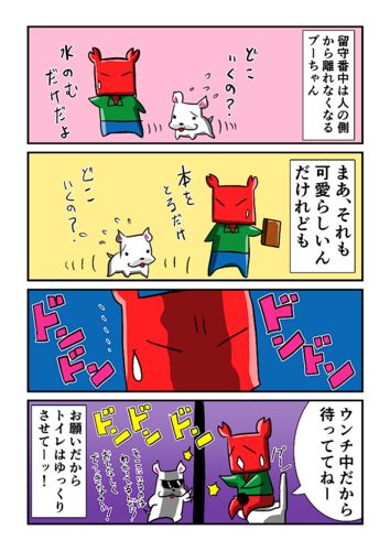 【フレンチブルのブーちゃんその36】家の中にカニ一人しかいないと分かると、動く度に慌ててついてくるブーちゃんw。まぁ、それはそれで可愛らしいんですが、うっかりトイレに入ったりするともう大変。出てくるまで外でドンドンドアを叩き続けるので、落ち着…