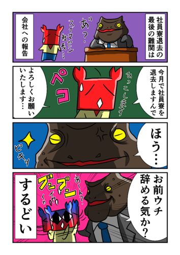 【はたらきガニメモリアルその41】部屋も決まり最後の難関は会社への報告。おそるおそる社員寮退去の話を切り出しましたが、"お前ウチ辞める気か?"と凄まれる!イヤイヤ滅相もありません!ちょっと環境を変えてみたいと思っただけで、まだ仕事は続けたいで…