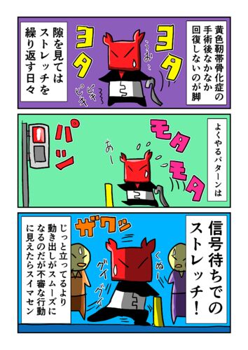 【黄色靭帯骨化症その227】術後なかなか回復しないのが歩行能力。念入りにストレッチすると若干動きやすいので、隙あらば脚のストレッチをする習慣がついた。外出先でも場所を選ばずそうで、よくあるパターンのひとつが信号待ちのとき。大体横断歩道前には車…