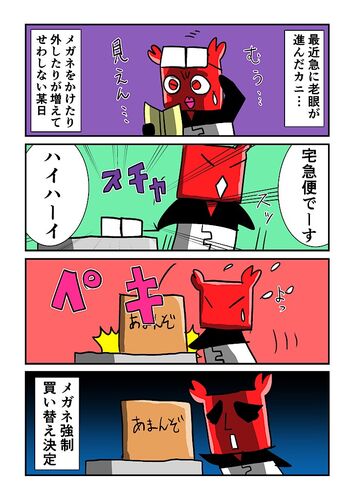 【カニ田一少年の事件簿その78】最近急に著しく老眼が進行し、メガネをかけたり外したりがせわしなくなってきたある日に宅急便が届く。何の気無しに机に荷物を置いたら"ペキ!"とイヤな音!荷物の下にはMyメガネが無惨な姿でへし折れてました…やっちまった……