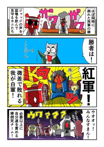 【カニリーヒルズ高校白書その100】ほぼ同時に倒れた両軍の棒!結果を固唾を飲んで見守る中、審判のコールは「勝者!紅軍!」微差ではあったが健闘虚しく我ら白軍の敗北となった!敗れた棒倒死チームは皆号泣!這いつくばり、座り込み、地面を殴りつけて己を…