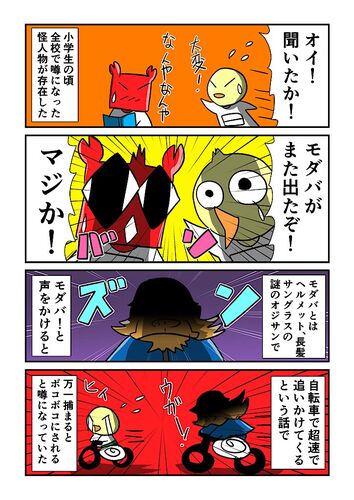 【恐怖体験カニビリバボーその85】小学生の頃に噂になったエピソード、それは謎の怪人物モダバ!姿はヘルメット・挑発・サングラスのおじさんで、"モダバ"と声をかけると自転車に乗って猛烈なスピードで追いかけてくるという!万一捕まるとボコボコに殴られ…