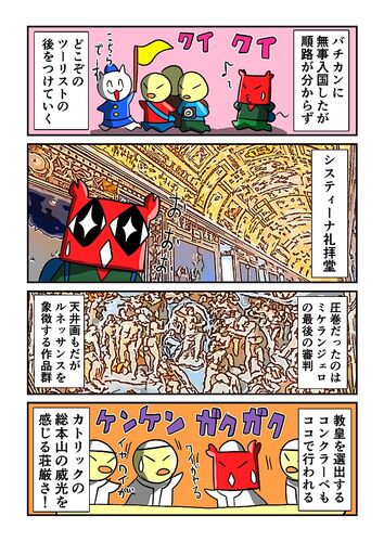 【カニローマ帝国見聞録その47】無事バチカンに入国したが、案外広くてどこから回っていいのかよく分からず。なので近くにいたツーリストの一団の後をしれっとついて行くw。あちこち回った後、システィーナ礼拝堂に辿り着く!これは異教徒の素人でも分かる圧…
