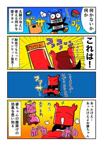 【黄色靭帯骨化症その286】モコモコスリッパのおかげで足下はあったまったが太腿が冷え冷えのカニ。何かないかと探してみたら数年前に献血で貰った小さめのブランケット発見!こんなもんでも無いよりはマシかと思い膝に掛けてみたところ、コレが想像以上にあ…