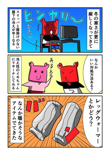 【黄色靭帯骨化症その291】モコモコスリッパと膝掛けで寒さ対策はバッチリだったのだが、冬の寒さが厳しくなるにつれて今度はスネまわりが冷たくなって困るカニ。冷え性のイモちゃんに何かイイ対策はないかと聞いてみたら、レッグウォーマーを進呈されました…