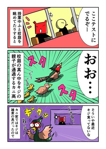 【カニリーヒルズ高校白書その168】カニ高で授業の最中外に目をやると、キジの親子が校庭のど真ん中を通過していた。まー犬猫じゃないのが田舎クオリティですな。ちなみにカニ家ではキジ肉はカニパパのなじみの猟師さんが居たのでよく食卓に上がっていた。お…