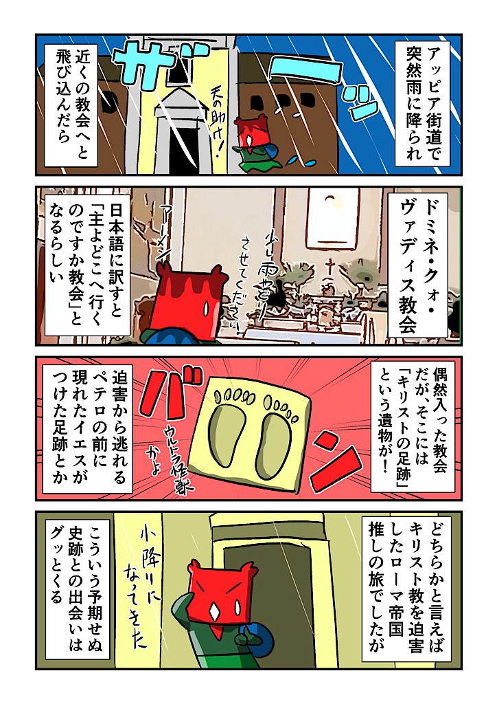 【カニローマ帝国見聞録その44】アッピア街道散策中に雨に降られたカニ。たまたま近くにあった教会に飛び込んで雨宿りをさせてもらう。中には若干名の信者さんらしき人が居たので邪魔にならないように見学していたら、建物の中に怪しい足跡の遺物発見。調べてみたらなんとコレが「キリストの足跡」!慌てて飛び込んだ教会は「ドミネ・クオ・ヴァディス教会」と言い、その意味は「主よ、どちらに行くのですか?教会」らしい。由緒を見ると暴帝ネロによるキリスト教迫害から逃れる為にローマを脱出しようとしたペテロがこの地でキリストに出会い、言葉をかけた事に由来するらしいです。結局雨が小降りになるまで小一時間ほど軒を借りる事になりました